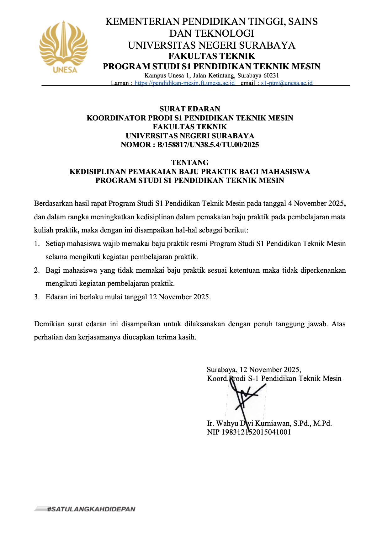 The Undergraduate Program in Mechanical Engineering Education, Faculty of Engineering, Universitas Negeri Surabaya (UNESA), is once again opening admission opportunities for prospective new students through the 2026 Computer-Based Written Examinat