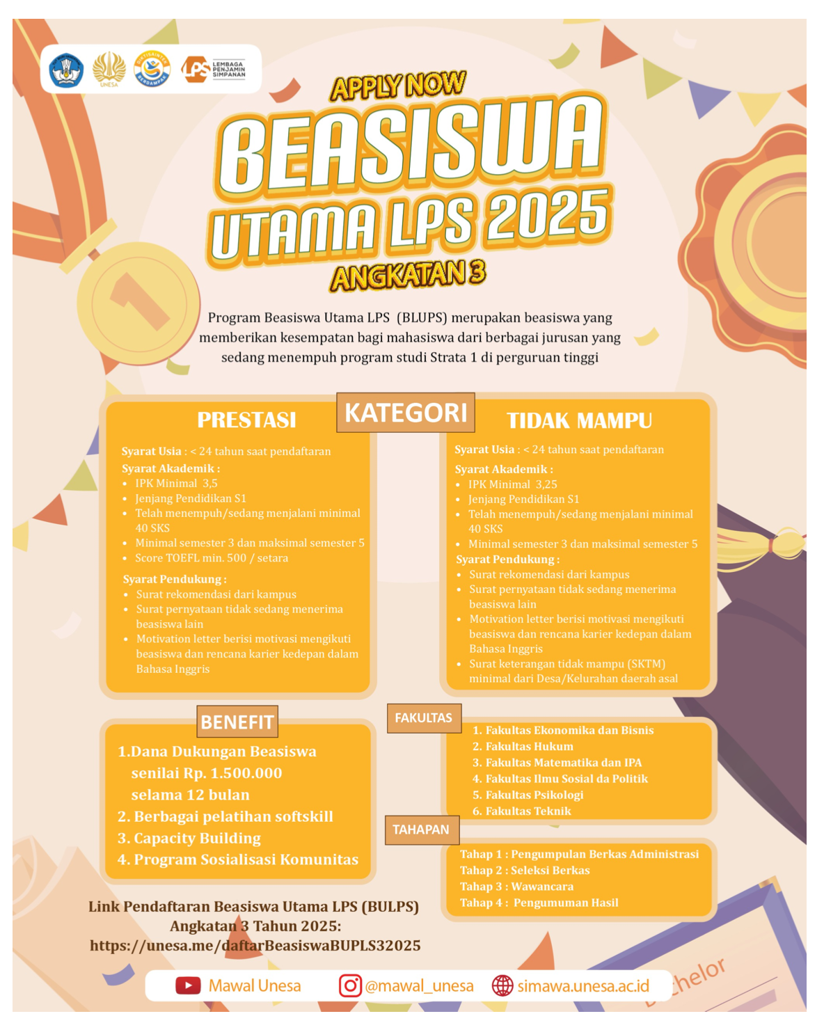 Universitas Negeri Surabaya (Unesa) melalui Direktorat Kemahasiswaan dan Alumni mengumumkan pembukaan pendaftaran Program Beasiswa Utama Lembaga Penjamin Simpanan (LPS) Angkatan 3 Tahun 2025. Program ini ditujukan bagi mahasiswa program studi Strata 1 (S1) di enam fakultas, yakni FMIPA, FISIPOL, Fakultas Teknik (FT), FEB, FH, dan FPsi.